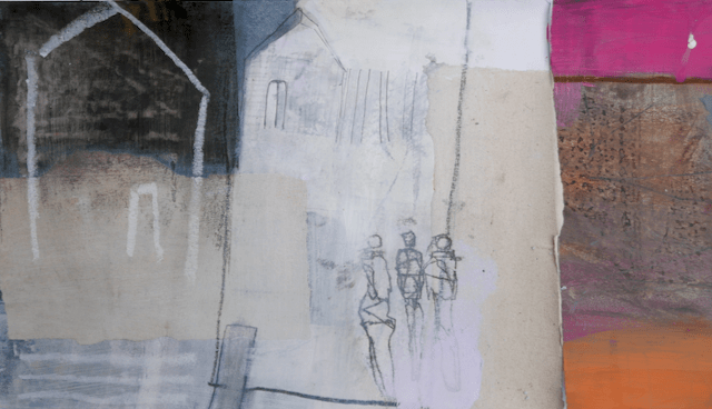Architektur trifft Figur, gedruckte Flächen begegnen Zeichnung, Collage ergänzt Malerei. Zwei unabhängige Teile treffen sich zu einem Ganzen. Brüche und Kanten gliedern den Raum.