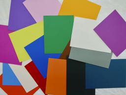 Farbige Pappen oder Papiere in gleichen Formaten. Dunkel, hell, farbig, schwarz, weiß, Mischtöne, als Ergänzung auch Strukturpapiere, bedruckte oder Textstellen. Gezielte Sammlung anlegen oder ohne festes Ziel einfach sammeln, was gefällt und geeignet erscheint. Formate etwa A5/A4. Einfacher Tonkarton oder selbst Pappen mit Restfarben grundieren und so Sammlungen anlegen.