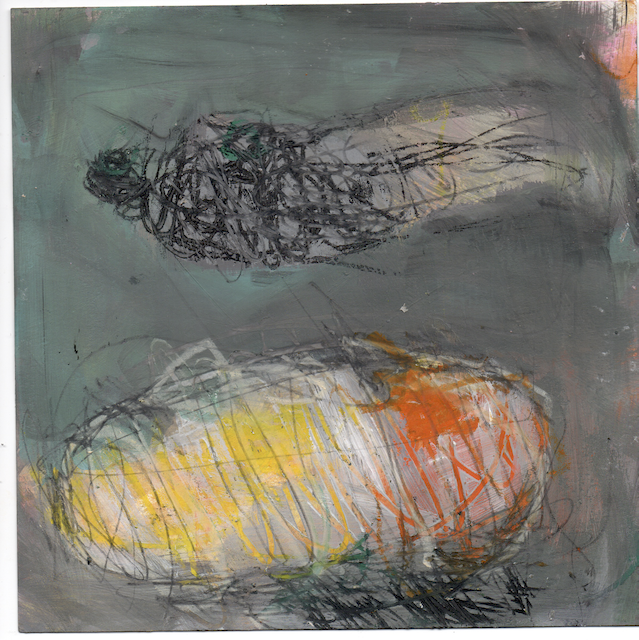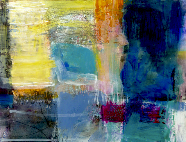 Ölfarbe, Abdrücke Monotypien auf der Radierpresse gedruckt und übermalt mit Kreiden, Kaseinfarbe, Acryl. Weite, Tiefe, Bewegung, Beziehung von Form und Raum.